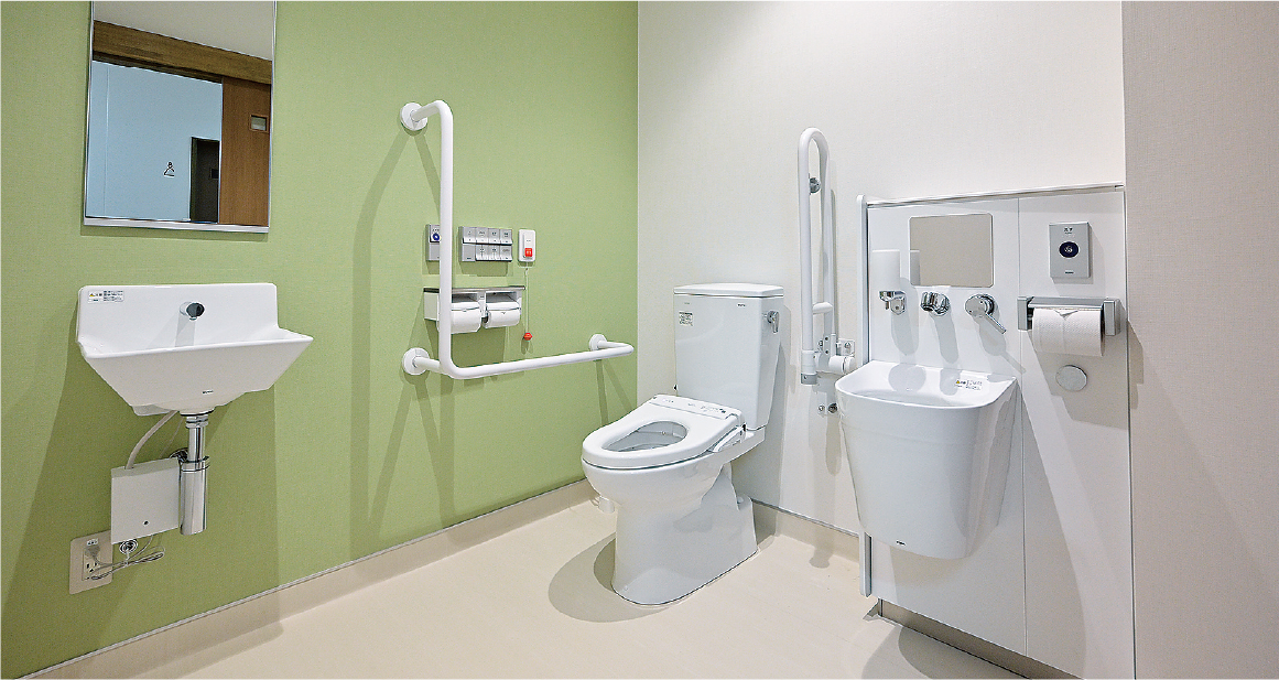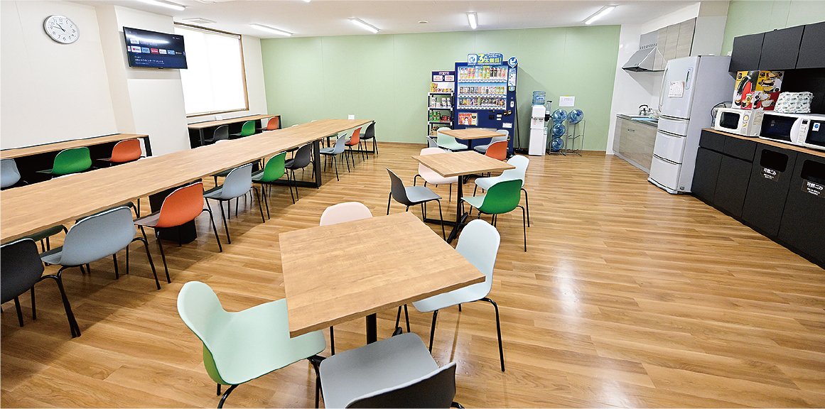 新工場の特徴は、〝ひとに優しい環境〟の実現を目指したこと。例えば、食堂は広々とさせて従業員がそれぞれにくつろげるスペースを担保し、明るい壁紙の採用やテレビを設置。これらは空間の利用促進を促す(居心地をよくする)ための工夫の一つだといいます。また、以前の社屋・工場では男女共用だったトイレは男女別に。さらに、車いすでも利用しやすい「誰でもトイレ」を設けて、従業員の多様性を歓迎できる設備を整えています。