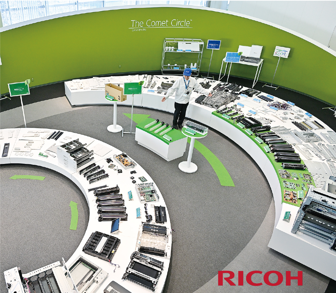 壮大な御殿場富士を背景に、環境事業開発センターがあります。元々は、複写機の国内製造拠点の工場でしたが、製造拠点の再編等により、一旦閉鎖し、複写機の再生、環境に優しい実証実験センターとして再稼働しました。エネルギー面では、木質バイオマスエネルギープラントを工場内に持ち、カーボンニュートラルに取り組んでいます。資源の再利用では、間伐材の燃料利用・内装材利用、漁業用網から再生したカーペット、複写機の原稿ガラスの再利用による建具など徹底した環境負荷軽減に取り組んでいます。複写機のリユース・リサイクルセンターは圧巻です。効率・コストを考えて整理された循環型社会実現のためのコンセプト「コメットサークル」、回収時のレベルによって、リユース・リサイクルの分別を行う仕組みです。その他にも、環境未来技術コーナー、環境ソリューションの展示、エコガーデンへの取組みなど、循環型社会、持続可能社会、脱炭素社会に向けたコンテンツが盛りだくさんです。次世代に未来を引き継ぐことは、手間もコストもかかります。限られた企業が利益を独占し繁栄することが、豊かな未来に繋がるのでしょうか。循環型社会を実現するための取組みが、結果的に持続可能で生産性が高い企業活動に繋がることを、リコーグループの活動が教えてくれます。